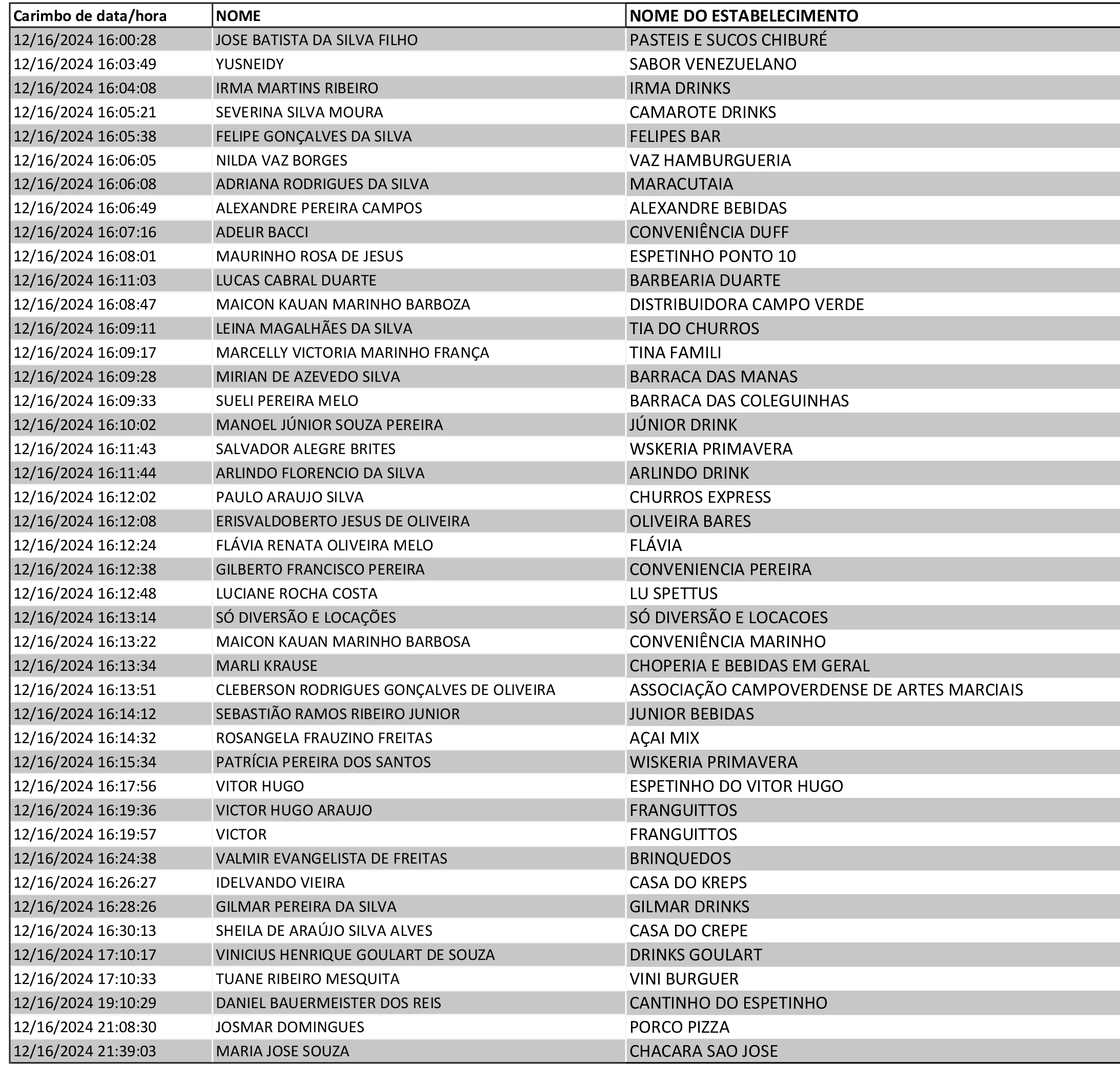As inscrições foram abertas às 16 horas de segunda-feira (16) e foram feitas eletronicamente por meio de um link disponibilizado pela Secretaria Municipal de Administração. Das 16h00 às 21h39, 42 comerciantes fizeram a inscrições, porém somente os 15 primeiros inscritos terão autorização para trabalharem durante o réveillon. (veja lista abaixo)