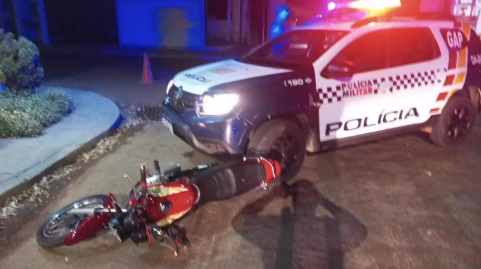 Casal em motocicleta sem CNH colide com viatura após fuga em alta velocidade