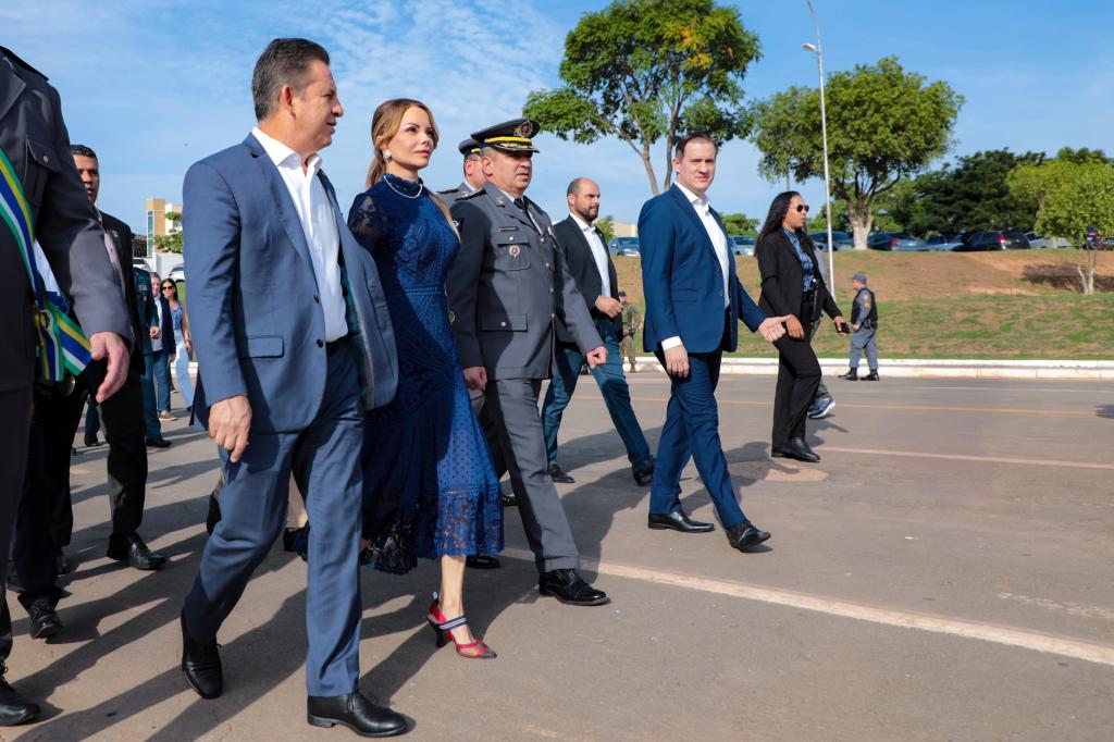 O governador Mauro Mendes esteve na solenidade acompanhado da primeira-dama, Virgínia Mendes, e deu as boas-vindas ao novo comandante-geral da PMMT, destacando que a troca de comando da instituição vem em conjunto com a implementação do programa “Tolerância Zero ao Crime Organizado”, que visa aumentar o combate às facções criminosas com diversas iniciativas na Segurança Pública do Estado.