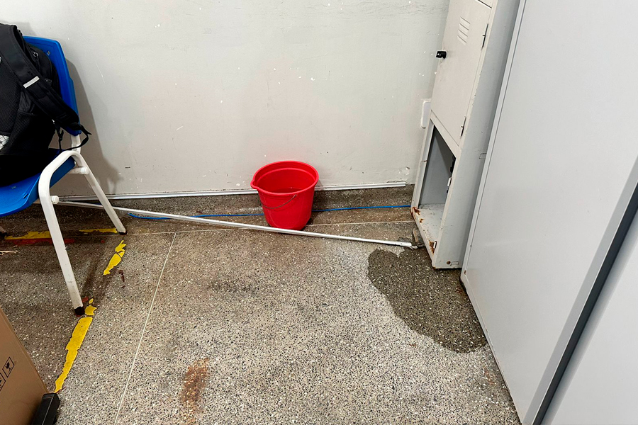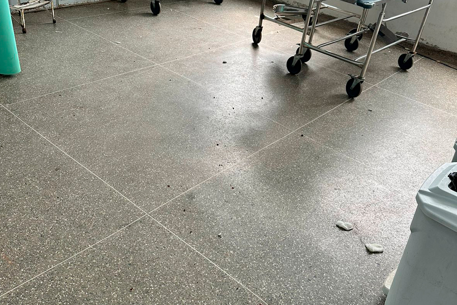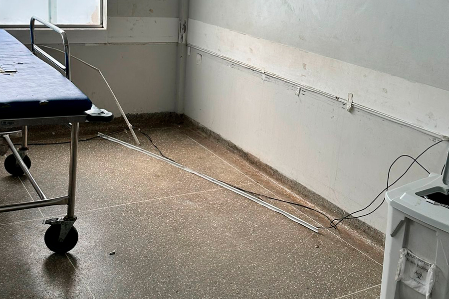 Entre as situações presenciadas, destacam-se lixo hospitalar jogado no chão, cestos de lixo quebrados e com tampas levantadas, além de fiações elétricas expostas, representando um risco iminente para quem circula pela unidade. O vazamento de ar-condicionado, que deixa o chão constantemente molhado, aumenta as chances de acidentes.